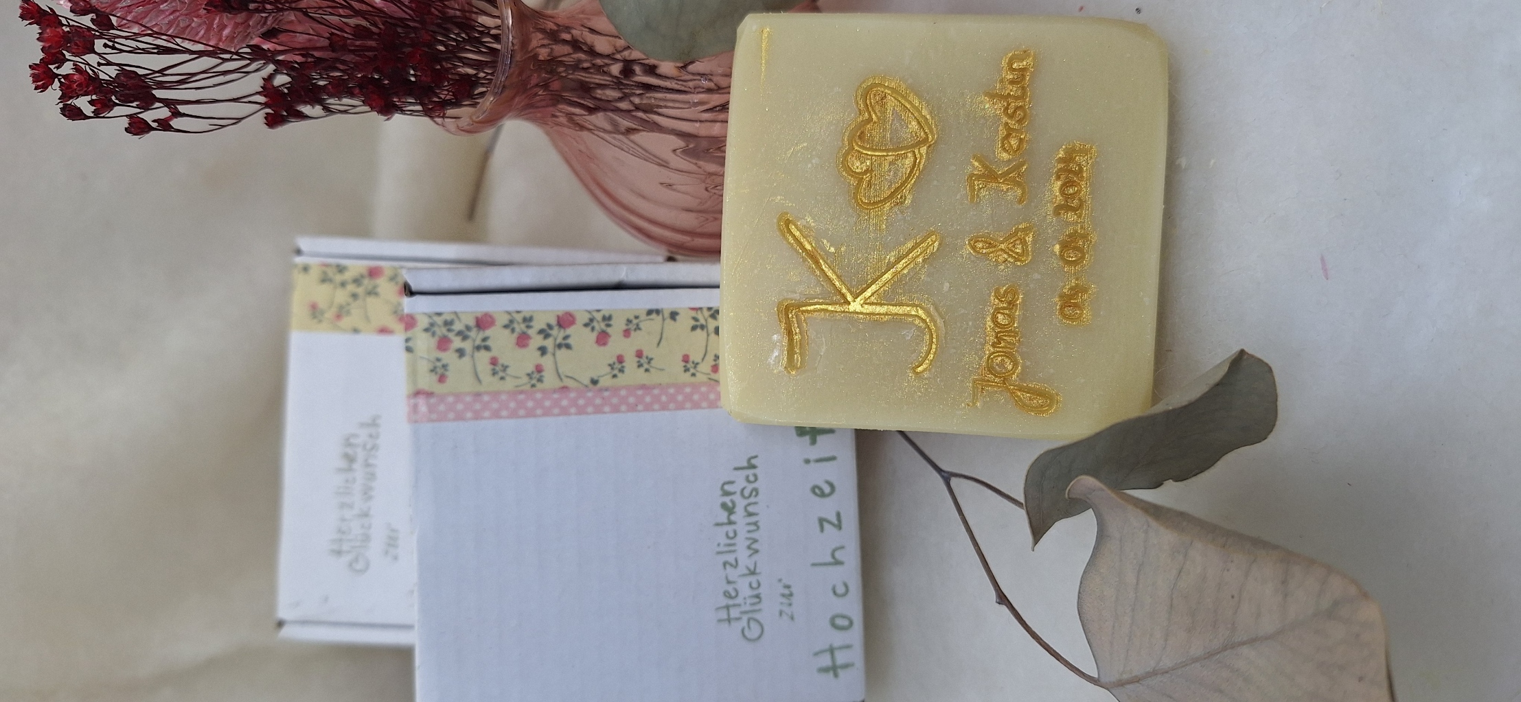 • Personalisierung: Wir bieten Ihnen die Möglichkeit, Ihre Seifen individuell zu gestalten, sei es durch Etiketten und/oder Stempel mit Namen, Datum oder besonderen Sprüchen. oder spezielle Verpackungen, die zum Hochzeitsstil passen.