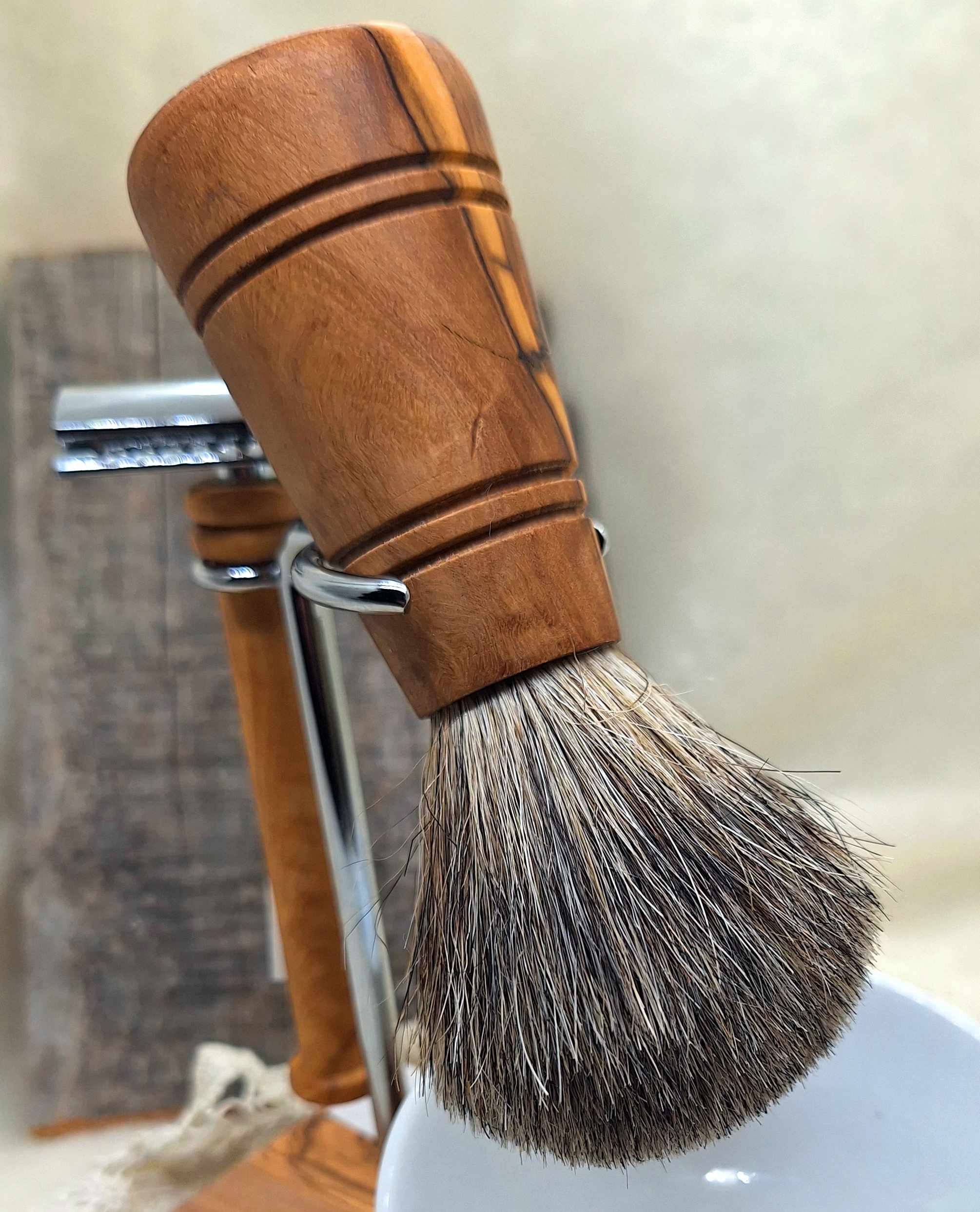 Sehr schönes Rasier-Set, bestehend aus Dachshaar-Pinsel mit Olivenholzgriff (Optional auch mit Kunsthaar), Rasierpinselhalter mit runder Rasierschale aus weißem Porzellan, einem Rasierhobel mit Olivenholzgriff und einer Rasierseife.