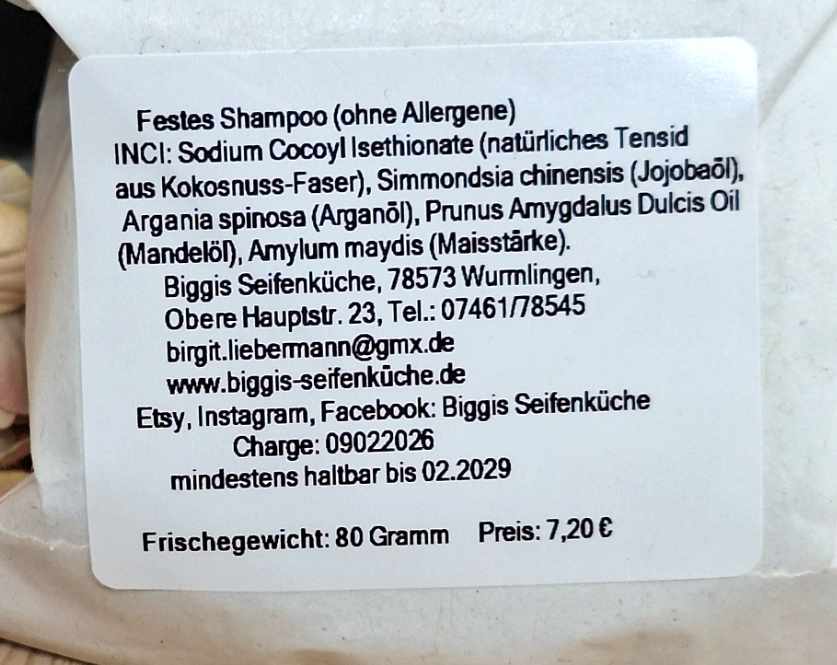 Ingredients: (INCI): Sodium Cocoyl Isothionate (natürliches Tensid aus Kokosnuss-Faser), Maisstärke (Amylum maydis), Jojobaöl (Simmondsia chinensis), Arganöl (Argania spinosa), Mandelöl (Prunus amygdalus dulcis).